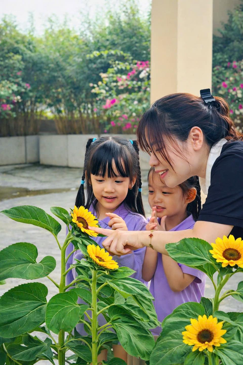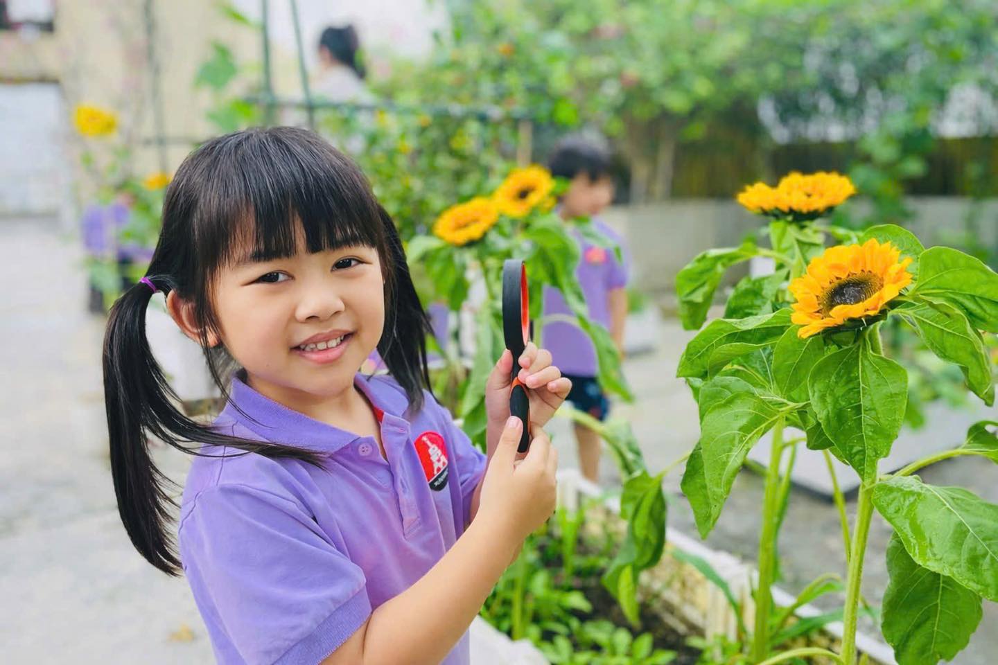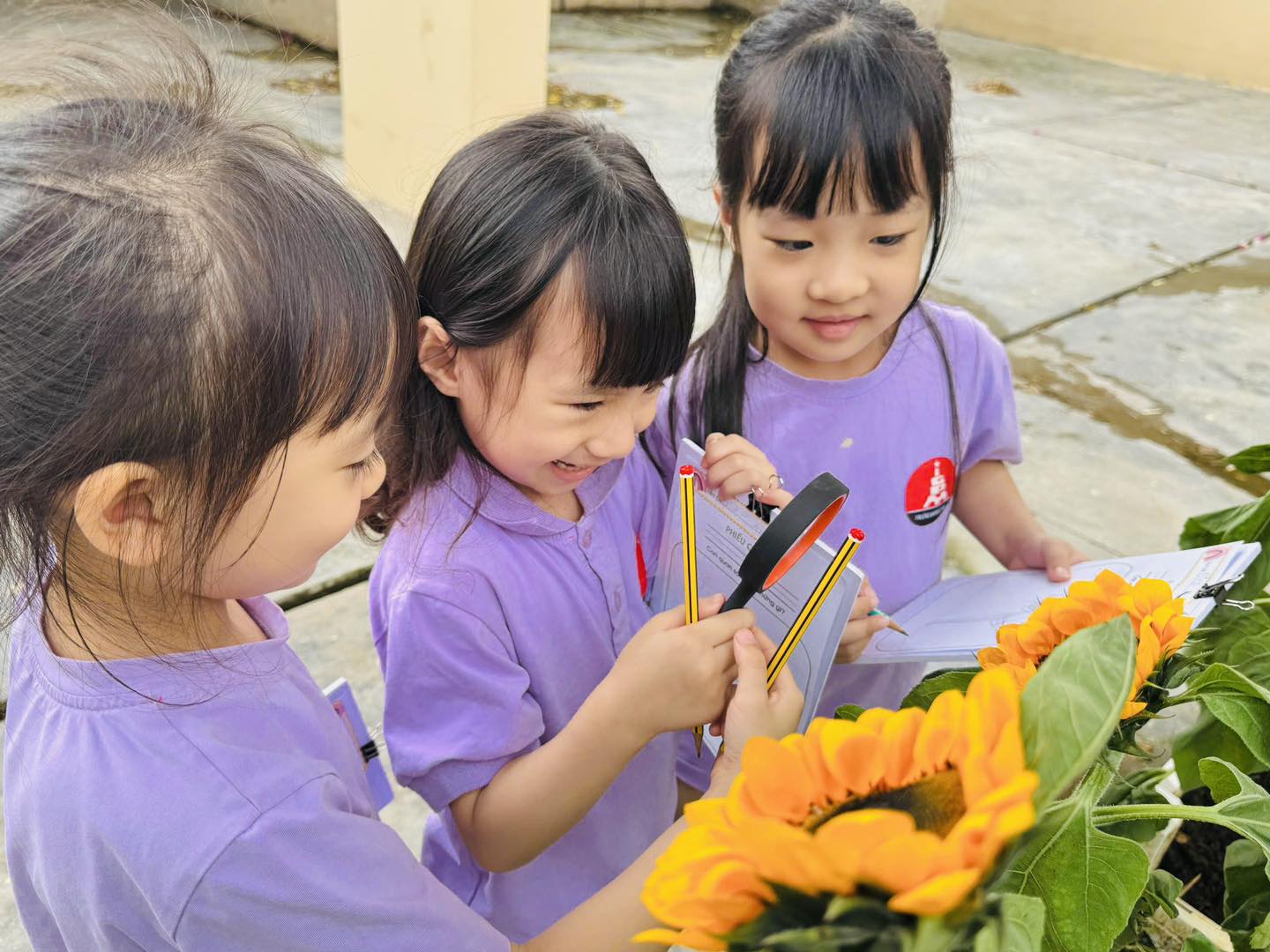 Những ngày đầu tháng 3 của khối lớp Star bắt đầu đầy cảm hứng và rực rỡ. Các bạn nhỏ không chỉ “hóa thân” thành những nông dân gieo hạt, chăm sóc, theo dõi quá trình phát triển của cây trong dự án mà còn trở thành những “nhà khoa học nhí”, nâng niu chiếc kính lúp diệu kỳ để soi rọi vào thế giới tí hon của hoa hướng dương. Những đôi mắt xoe tròn đầy ngỡ ngàng khi phát hiện lớp lông tơ mịn màng trên thân cây, những hạt phấn li ti đang “ẩn mình” giữa nhị hoa rực rỡ. Từ những quan sát tỉ mỉ ấy, các bạn nắn nót vẽ lại, “ghi chép” vào nhật ký dự án với tất cả sự say mê.