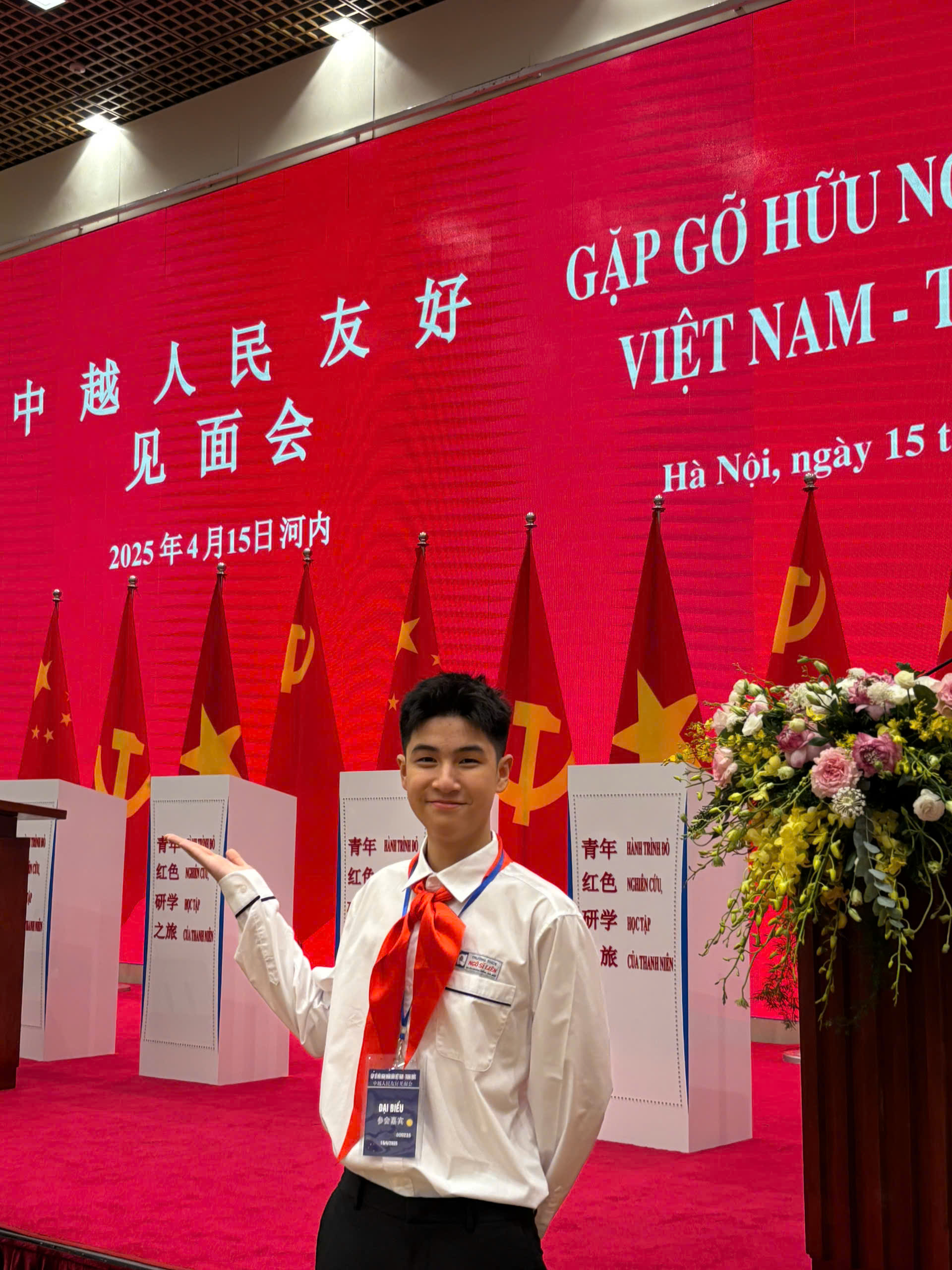 Tháng 4/2025, Trường cảm thấy vô cùng hãnh diện khi là một trong 5 học sinh Việt Nam được lựa chọn tham gia sự kiện “Gặp gỡ hữu nghị nhân dân Việt Nam - Trung Quốc”, cùng Tổng Bí thư, Chủ tịch nước Tô Lâm đón tiếp đoàn lãnh đạo cấp cao của nước láng giềng. “Mình vừa vui vừa hồi hộp vì đây là chương trình mang tính trang trọng, đòi hỏi sự chỉn chu cao. Tuy nhiên, đây là cơ hội vô cùng quý giá cho mình được tham gia nhiều hoạt động ý nghĩa, lắng nghe bài phát biểu của lãnh đạo 2 nước, gặp gỡ và trò chuyện với các Tiến sĩ, nghiên cứu sinh của 2 quốc gia. Bên cạnh đó, mình còn tham dự lễ khởi động hành trình đỏ nghiên cứu, học tập của thanh niên và có cơ hội giao lưu, phỏng vấn các thanh niên Trung Quốc. Những trải nghiệm đó giúp mình mở rộng hiểu biết, đồng thời cảm nhận sâu sắc về ý nghĩa và tầm vóc của một sự kiện chính trị - ngoại giao quan trọng”, cậu cho biết.