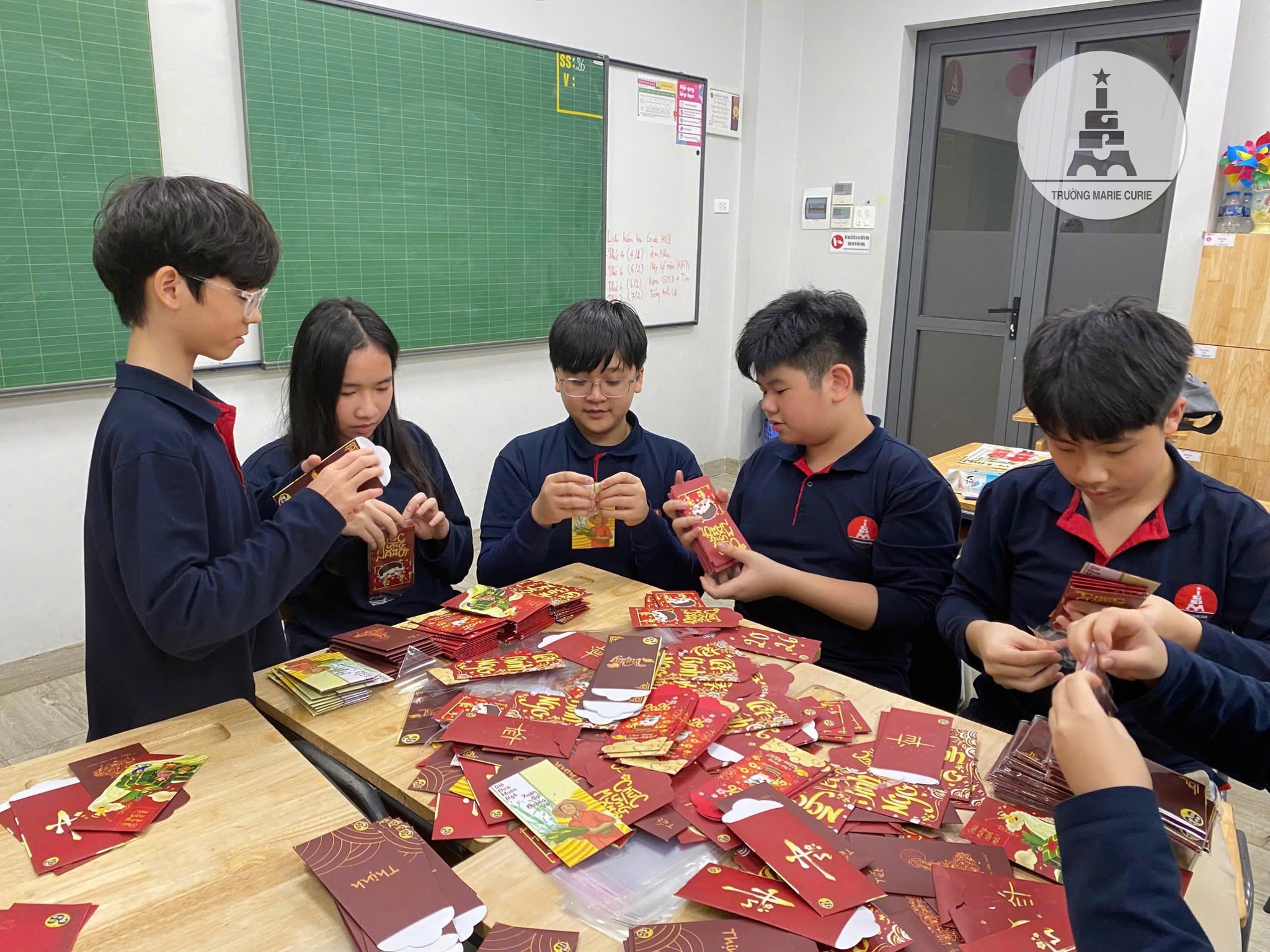 Trong khi đó, tập thể 8P4 đã trao 100 suất quà gồm bánh chưng và tiền lì xì cho các bệnh nhân ở khoa Ung bướu, bệnh viện Bạch Mai, Hà Nội. Theo cô chủ nhiệm Nguyễn Thủy, hoạt động thiết kế bao lì xì để bán gây quỹ của các học trò đã nhận được sự ủng hộ tích cực của các bố mẹ, thầy trò trong trường, thu về được gần 13 triệu đồng.