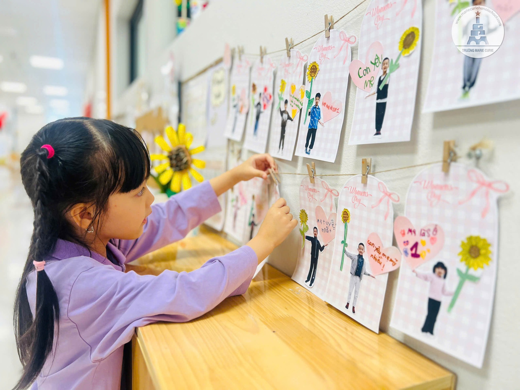 Chào mừng ngày 8/3, các bạn nhỏ khối Mầm non cũng tự tay làm thiệp và viết những lời cảm ơn “lịm tim” như: “Con yêu mẹ nhất trên đời. Cảm ơn mẹ đã sinh ra con!”, “Mẹ là số 1”, “Mẹ tuyệt vời nhất”... rồi treo ngoài hành lang để mang tới sự bất ngờ cho mẹ khi tới trường đón về.