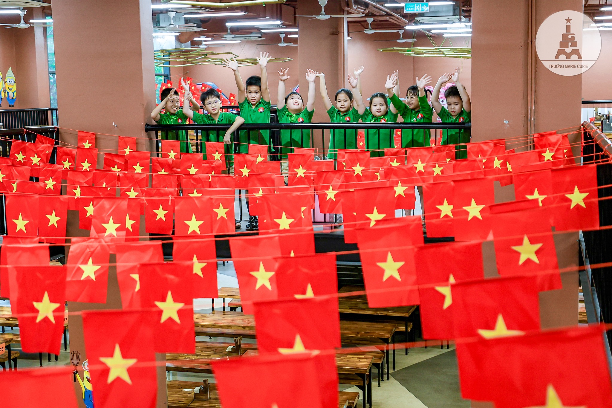 Say sưa ngắm nhìn không gian canteen, cô Kim Lan (GV Star 3) chia sẻ: “Canteen quen thuộc bỗng rực rỡ bởi sắc đỏ của những lá cờ. Mỗi lần đi ngang qua, tôi lại thấy lòng lắng lại với niềm tự hào và biết ơn sâu sắc. Những khoảnh khắc bình dị ấy càng khiến tôi thêm yêu nghề, yêu mái trường Marie Curie và trân trọng những giá trị tốt đẹp mà các con đang lớn lên cùng mỗi ngày”.