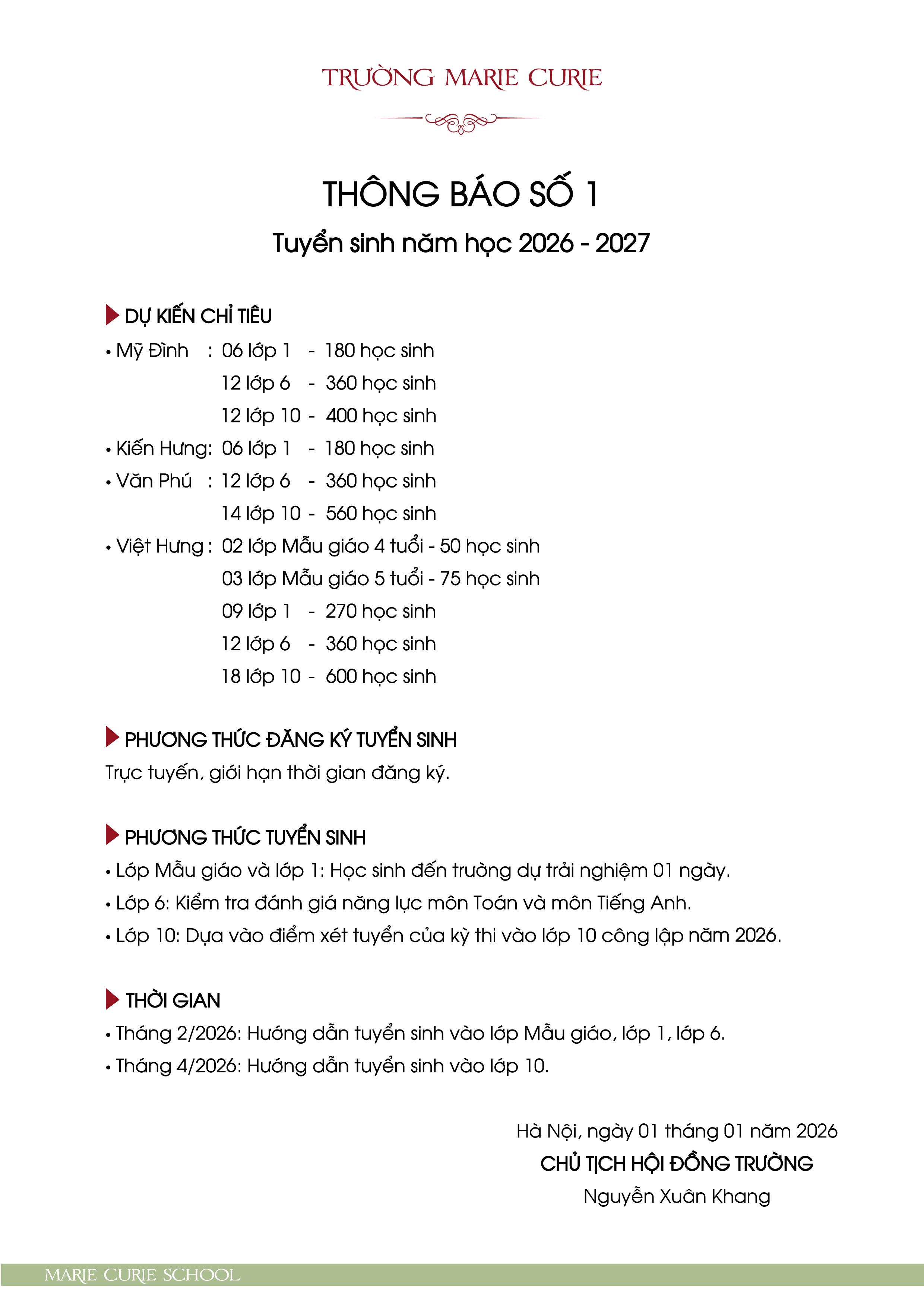 Thứ sáu, 16 Tháng 1 2026 14:36 Viết bởi TRUONG MARIE* Cơ sở MỸ ĐÌNH (TH - THCS - THPT)